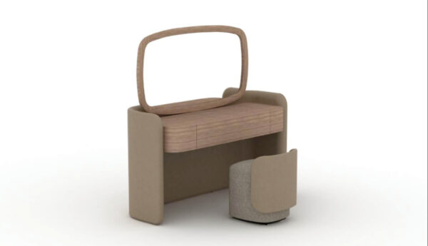 میز و پاف ماهورا شامل میزی با آینه و کشوهای جادار برای نگهداری لوازم آرایش و صندلیای هماهنگ با طراحی مینیمال و زنانه است
